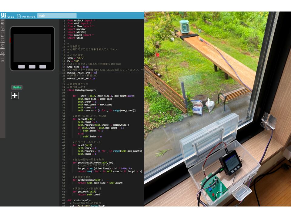 ※設置画像に写っているマイコンは付属しませんが、ネットで簡単に入手できます。使用機種の情報や、私たちが使用するために作った雨量表示用のプログラム(公開中)へのURLは、印刷して同梱しますので、ぜひ挑戦してみてください。